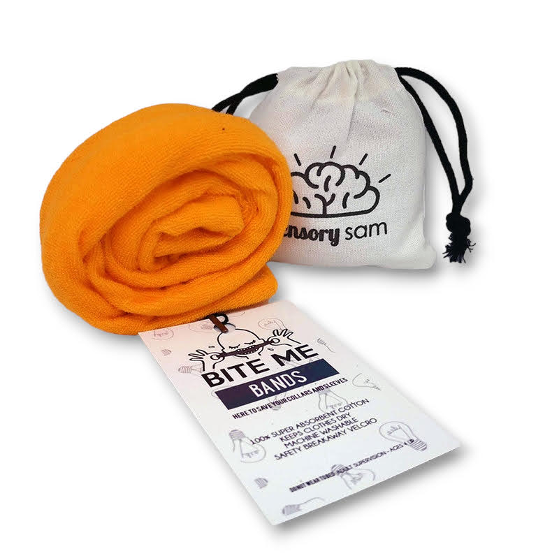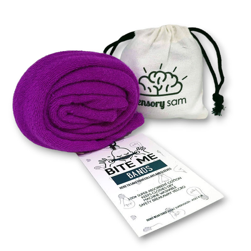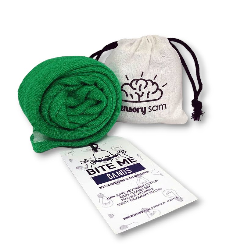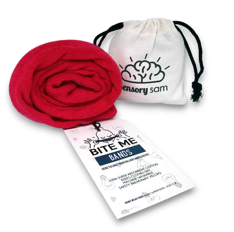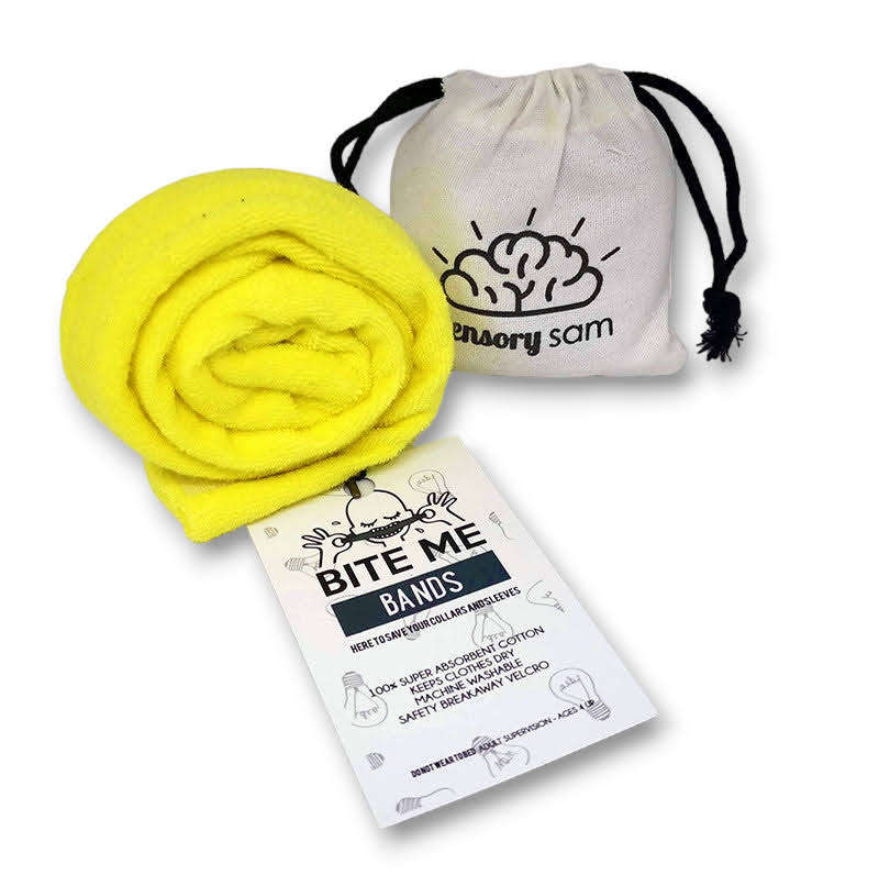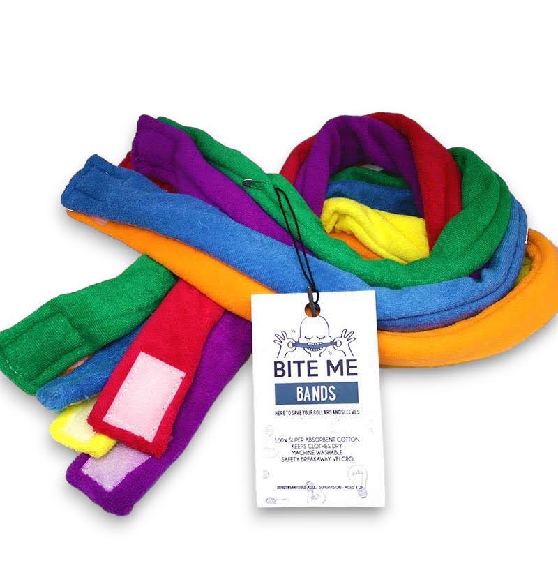 These super absorbent necklaces are designed to redirect from chewing and biting clothing or other items. Unlike silicone chew necklaces, these cotton terry cloth bite bands soak up drool, keeping shirts dry even after extended periods of chewing.