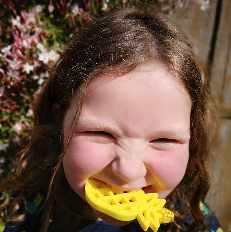 Plenty of tactile chewing with one side raised bumps, and the other raised grate outline.