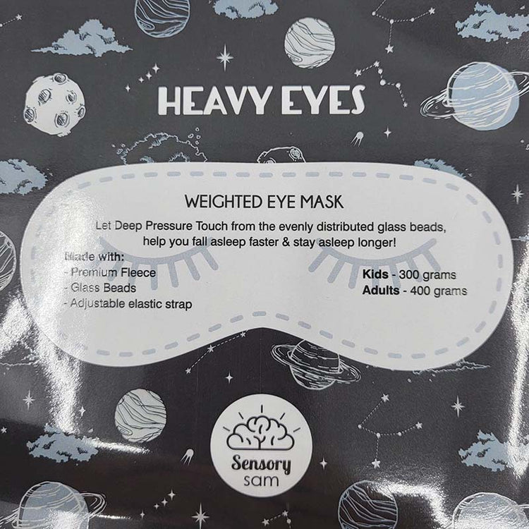The Heavy eyes weighted sleep mask is a great addition to your nightime routine. Weighted with our non toxic glass microbeads providing gentle pressure that sends a signal to your brain to relax, while also blocking out sleep-disturbing light. In our cool night inspired Space Cadet pattern. Great for at home, or traveling or freeze it for headaches and Migranne treatment.
