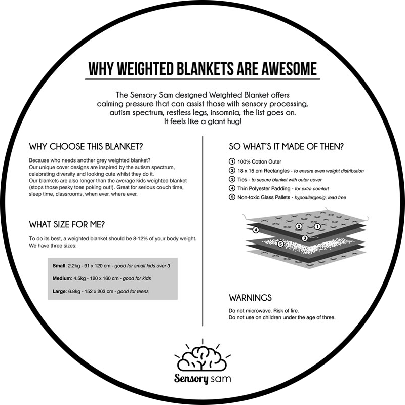 Dream on with a custom designed sensory Sam Weighted Blanket! Sleep isn’t a luxury its a necessity. Enter Sensory Sam weighted blanket. It can make you fall asleep faster and stay asleep longer.