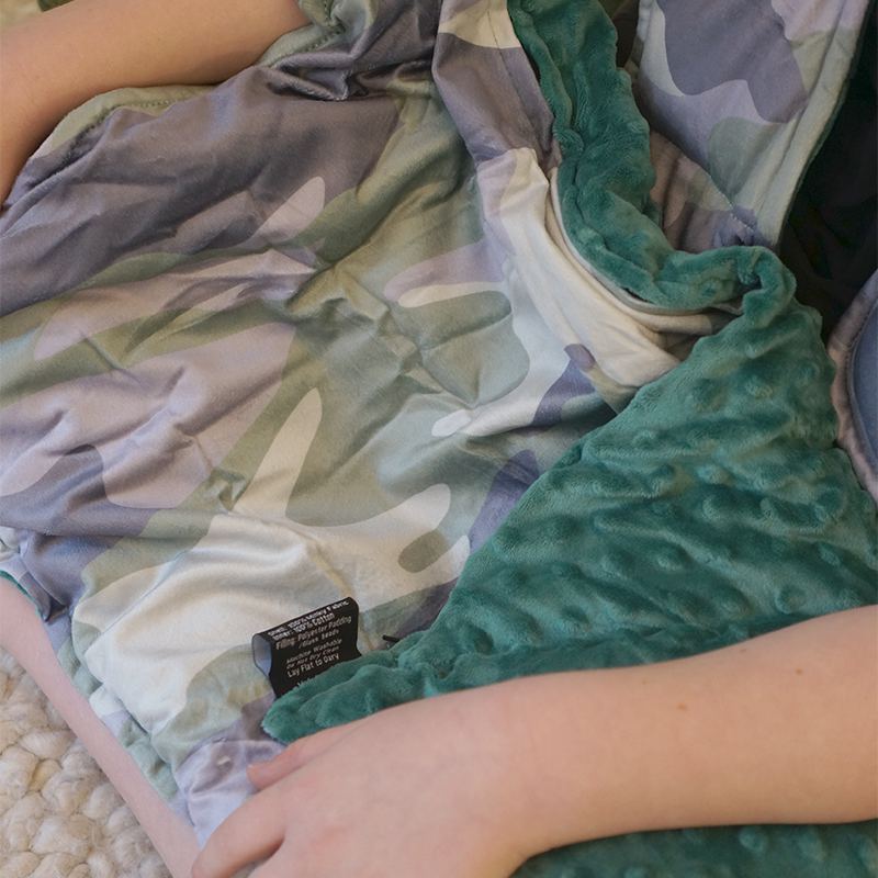 Blend in naturally with the Cool Camo Lap Pad! More discreet and portable than a full blanket, this guy is great for chilling and travelling. In the classroom it can even help keep those bums in seats longer, leading to better classroom performance. Slinky minky outer fabric feels like velvet, with bumpy minky dots on the back. Cool cotton separate striped inner makes this guy easy to wash.