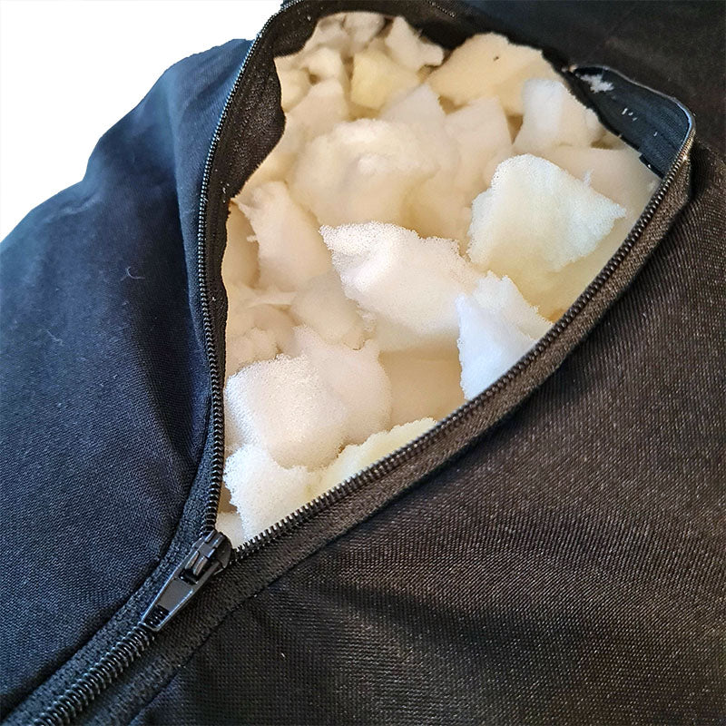- Stuffed fill of quality foam chip filling. Nice and soft and quiet, unlike normal bean bag filling.