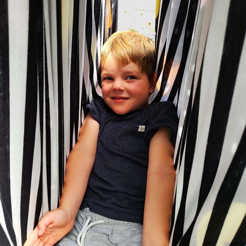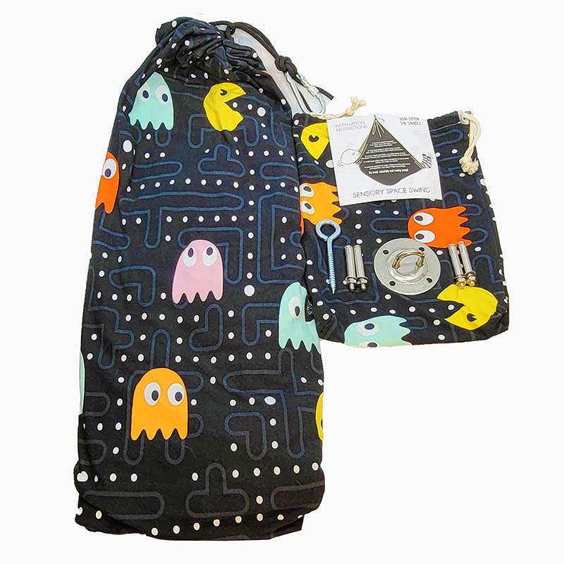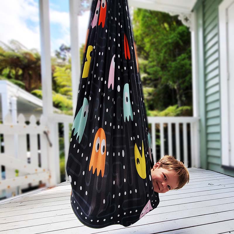 Made out of a double layer of super soft cotton spandex (reversible) this truly multi-functional swing encourages movement and exercise and can be used when sitting, standing or lying down. The kids can climb in the swing, stretch out and move around inside the swing, they learn body awareness, balance, motor planning and spatial skills. A fun, private space to bounce, swing, spin or just lie motionless while enjoying the movement. A must swing for your clinic, home or school.
