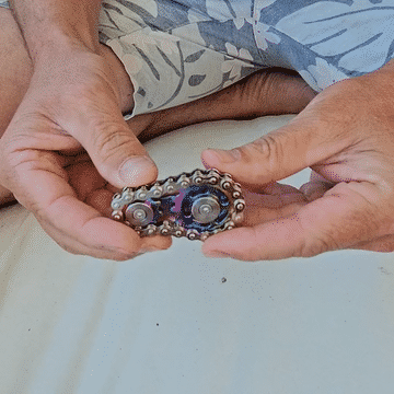 Spin and roll this weighty machinery from the centre wheel, or roll out the chain on your skin and hands, for that ultimate tactile vestibular feedback.