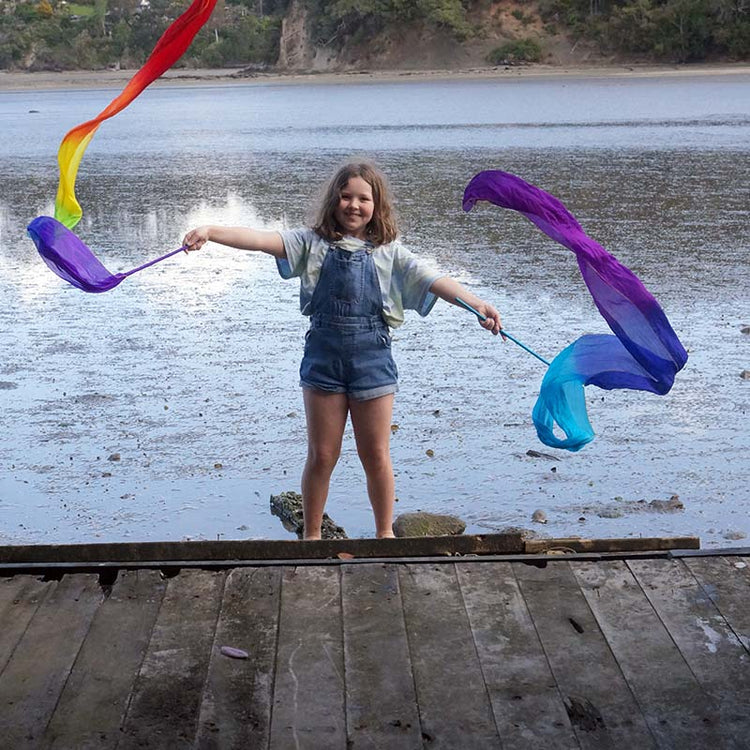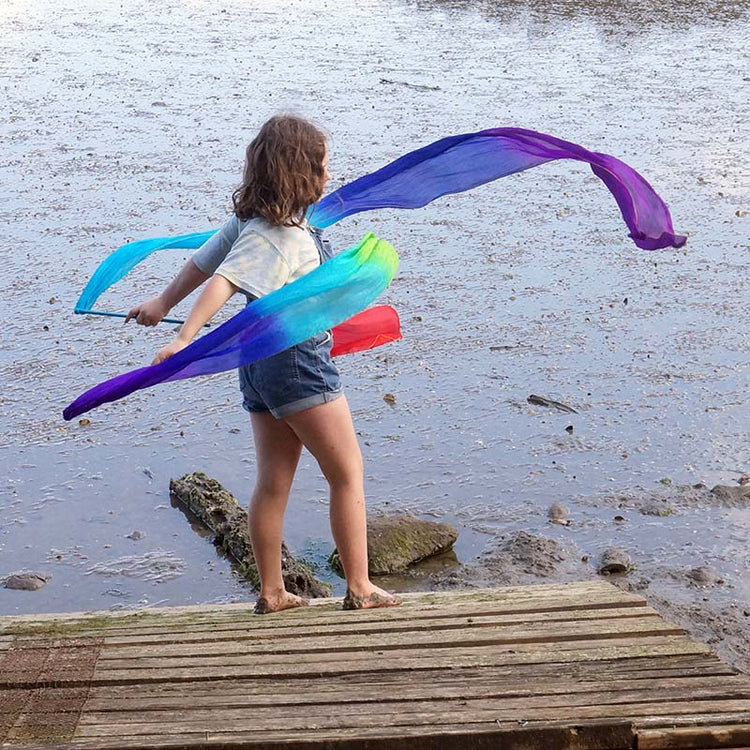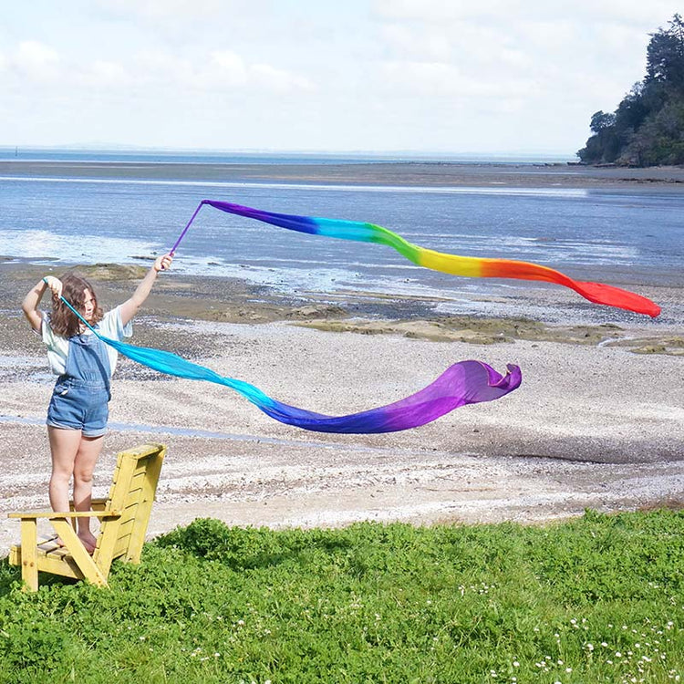 Sensory Sam beautiful play ribbons. Swirl and flick like a rhythmic gymnast. Clothing accessory or an awesome prop in an imaginative play, get your hippy vibes on!