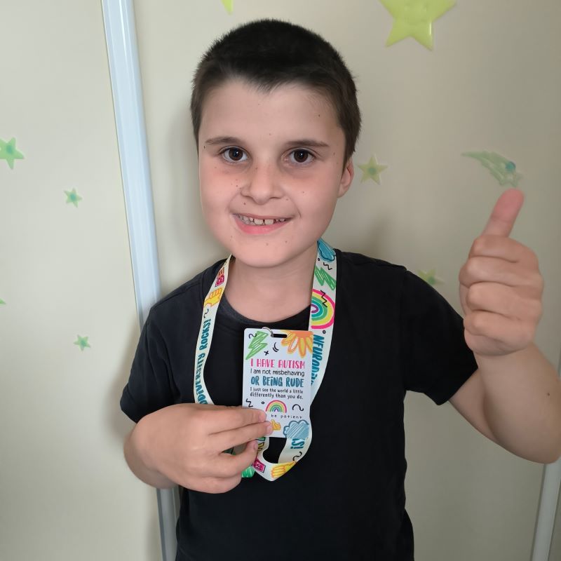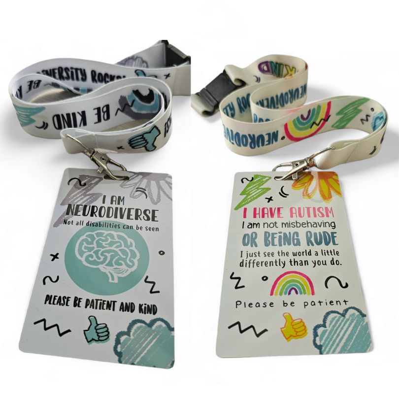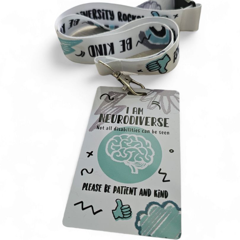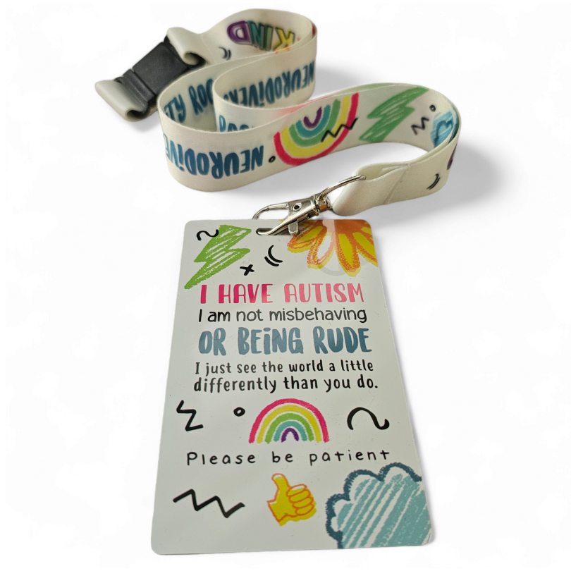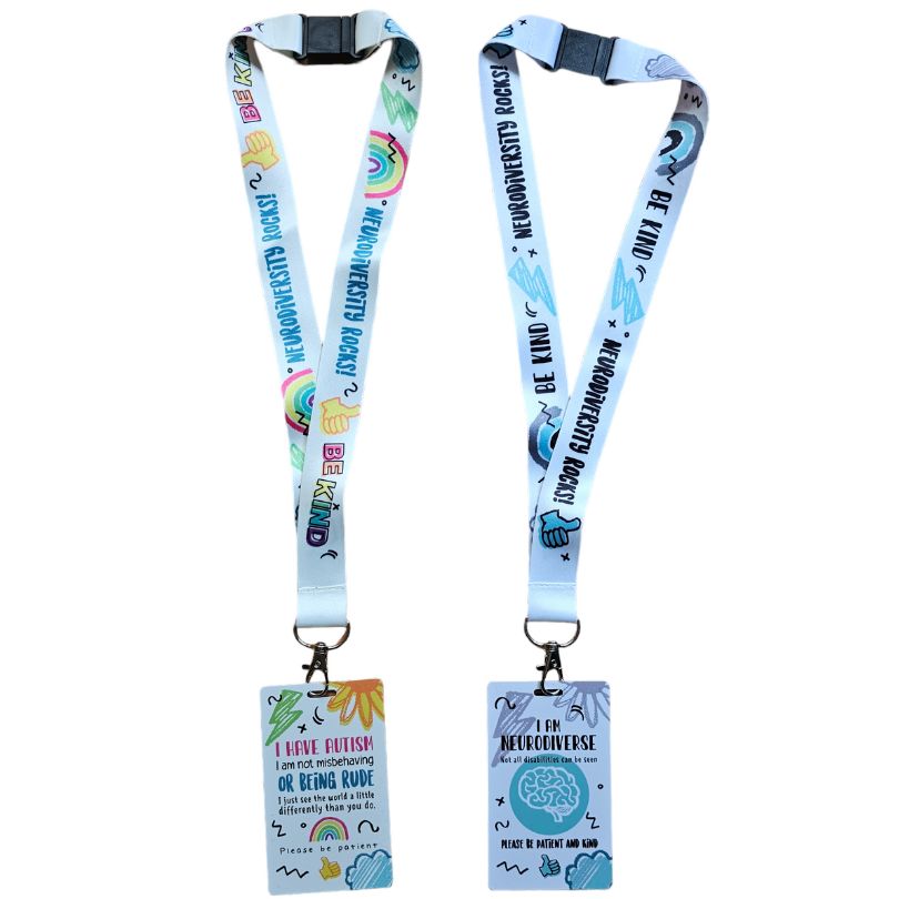 Enter lanyard, to inform the public, health professionals, classroom or members of staff in public places, that the person wearing it has autism or a neurodiversity. This lets people know they might need a helping hand, patience, understanding, or simply more time. Sometimes labels can be very helpful in public and not everyone knows what a sunflower lanyard means.