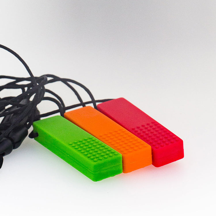 Get the original chewy necklace here. Mixed textures for sensory variety. Large bumps on one side and small on the other. Can even reach those back molars.
