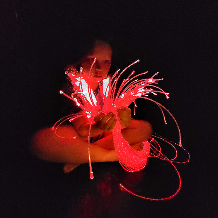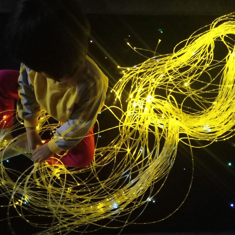 Flexible fibre optic lights offer multi-sensory stimulation. Strands constantly change colors to encourage visual tracking and can be bent into cool shapes or draped on the body for tactile input and proprioception. Fiber optics do not generate heat or electricity, so they are completely safe to touch. They can twinkle, colour cycle and more. Bluetooth can control with your phone. Creates a soothing, interactive environment that supports calm, attention and focus.